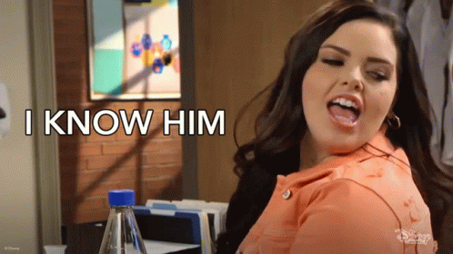 Lou Hockhauser (Miranda May) says 'I KNOW HIM' while looking over her shoulder in an office setting.