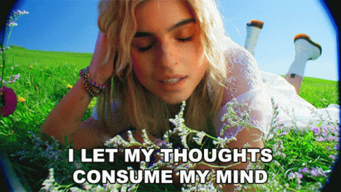 Renforshort lies in a vibrant flower field, reflecting on thoughts consuming her mind, from her song 'Afterthoughts'.