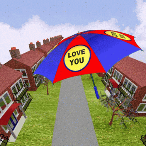 A vibrant red and blue umbrella with 'LOVE YOU' floats along a winding path lined with houses and trees.