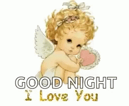 An adorable animated baby angel with wings holds a heart, delivering a sweet 'Good Night I Love You' message.