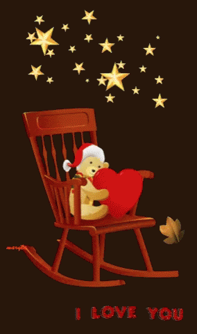 A cute teddy bear in a rocking chair holds a red heart, with 'I LOVE YOU' text and stars above.
