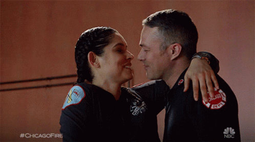 Stella Kidd and Kelly Severide share a passionate kiss, wearing their Chicago Fire department uniforms.
