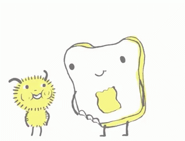 An adorable animated drawing of a piece of toast and a fuzzy creature sharing a loving hug.