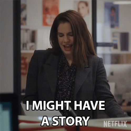 Vivian Kent from Inventing Anna, portrayed by Anna Chlumsky, states "I might have a story" in an office setting.