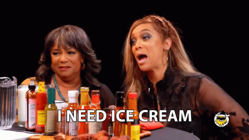 Tyra Banks reacts intensely on Hot Ones, exclaiming her desperate need for ice cream after a spicy wing.