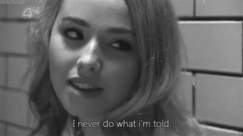 A woman defiantly states, 'I never do what I'm told,' in a black and white clip.