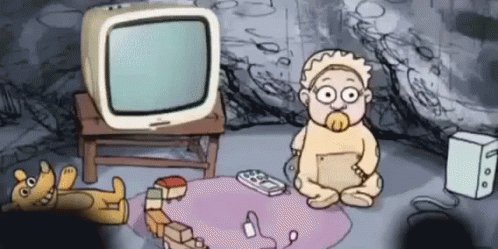 A cartoon baby watches 'I Nuovi Mostri' from Striscia La Notizia, featuring Bruno Vespa and Valeria Marini, as a monster bursts out.