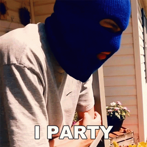 Willie, wearing a blue ski mask and a Nike shirt, declares 'I Party' while holding a knife.