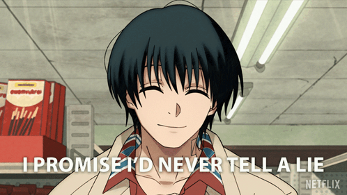 Yoichi Nagumo from Sakamoto Days smiles, stating 'I promise I'd never tell a lie'.