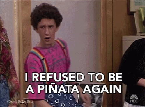 Screech from Saved By The Bell declares, 'I refused to be a piñata again,' in this memorable scene.