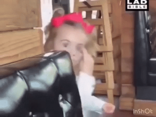 A little girl with a red bow makes a funny face and hides, giving a mischievous "I see you" look.