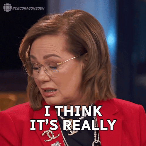Arlene Dickinson, wearing a red jacket and glasses, states 'I think it's really impressive' on CBC Dragons' Den.