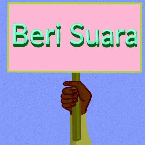 A hand holds a sign with 'Beri Suara' (Vote) in Indonesian, encouraging participation in elections.