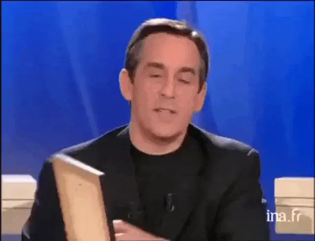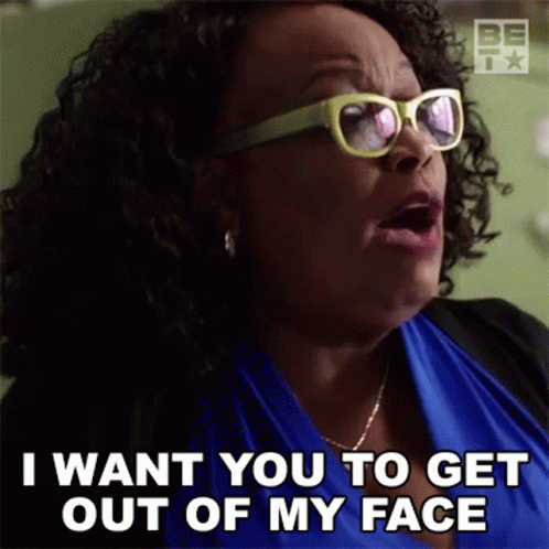 Yvette Cason as Estelle emphatically tells someone to get out of her face, wearing glasses and a blue shirt.