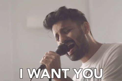 A man passionately sings the lyrics 'I Want You To Want Me' into a microphone, expressing emotion.