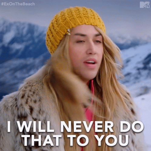 Adore Delano, wearing a fur coat and yellow beanie, sincerely states "I will never do that to you" in a snowy landscape.