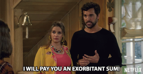 Fernando Fuller (Juan Pablo Di Pace) intensely offers an exorbitant sum, with Kimmy Gibbler (Andrea Barber) looking on.