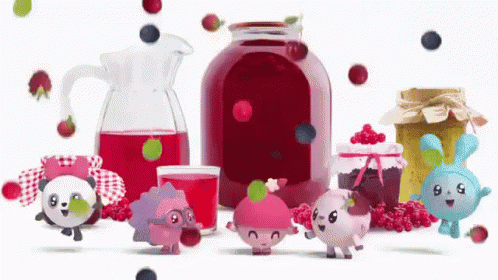 Malyshariki and Smeshariki characters dance happily with fresh berries, juice, and jam.