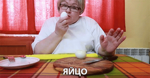 Баба Рая humorously demonstrates an egg, with the word 'яйцо' visible on the table.