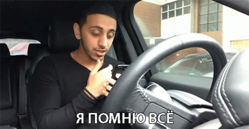 Ellai in a car, looking at his phone with the caption 'I Remember Everything' (Я ПОМНЮ ВСЁ).