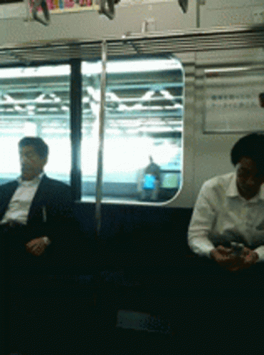 Two men riding a subway train in Japan, one in a suit and the other in a white shirt.