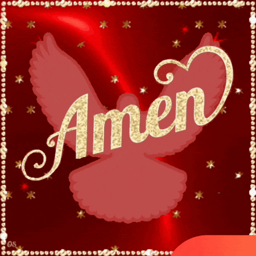 A spiritual image featuring a red background, a dove silhouette, and the golden word 'Amen' with 'One Spirit'.