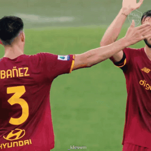 Roger Ibanez, wearing jersey number 3, high-fives a teammate on the soccer field after a play.