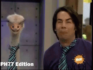 Spencer Shay from iCarly reacts with a shocked expression next to a puppet ostrich wearing a tie.