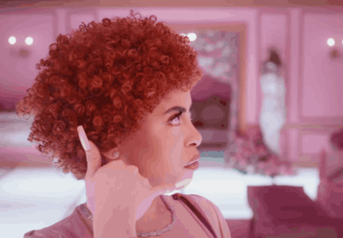 Ice Spice, the American rapper, makes a 'call me' gesture and looks directly at the camera in a pink setting.