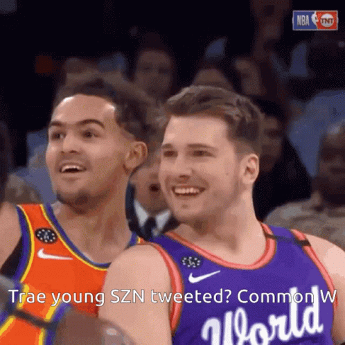 Trae Young and Luka Doncic share a laugh on the basketball court, celebrating a 'Common W' moment during Trae Young SZN.