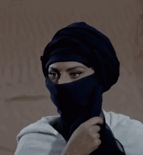 Sophia Loren, an icon of cinema, gazes intently in a desert film scene, wearing a blue head covering.