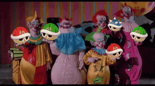 Insane Clown Posse members Shaggy2Dope and Violent J pose with other clowns, holding Mario Kart shells.