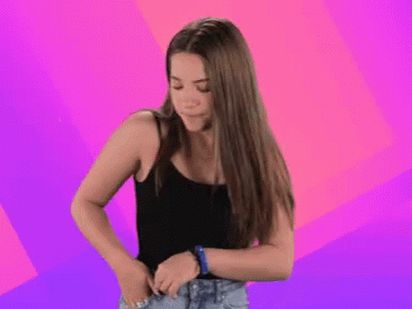 Mackenzie Ziegler gestures as the text 'IDC' appears, wearing a black tank top and blue jeans.