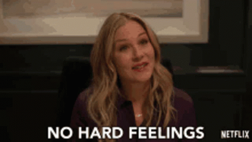 A woman expresses 'No hard feelings' with a subtle smirk, embodying an 'idgaf' attitude.