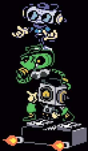 A vibrant pixel art robot, with a speaker body and a cassette player head, performs an idle dance while stacking up.