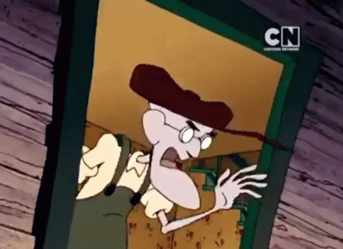 Eustace Bagge screaming and the Hunchback from Courage the Cowardly Dog standing in the rain.