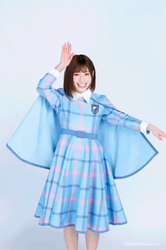 Higashimura Mei of Hinatazaka46 in a blue and pink plaid dress, posing with bunny ears and a bright smile.