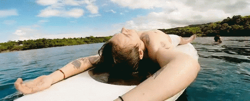 Harry Styles relaxing on a surfboard in the clear blue waters of Jamaica, enjoying a peaceful vacation.