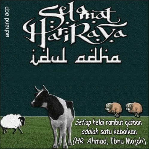 Happy Eid al-Adha greeting card featuring a cow and sheep, with a message of forgiveness and a quote about sacrifice.