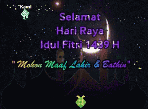 Animated greeting card wishing Selamat Hari Raya Idul Fitri 1439 H, with a message of forgiveness.