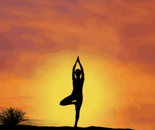 A silhouette performs a yoga pose against a vibrant sunset, celebrating International Yoga Day with the message "Yoga, Every Day!".