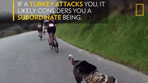 A turkey aggressively chases a group of cyclists, likely considering them subordinate beings, as stated by National Geographic.