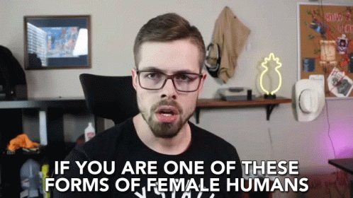 Man with glasses and beard, 'Basically Homeless', says 'If you are one of these forms of female humans'.