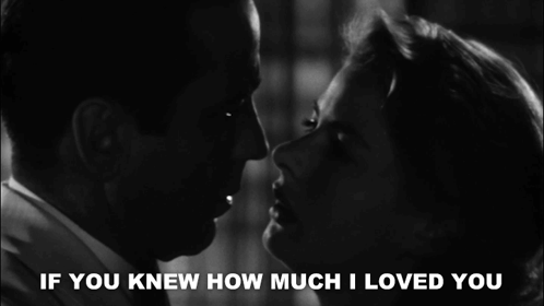 Rick Blaine and Ilsa Lund share an emotional moment in Casablanca, with the caption 'If You Knew How Much I Loved You'.