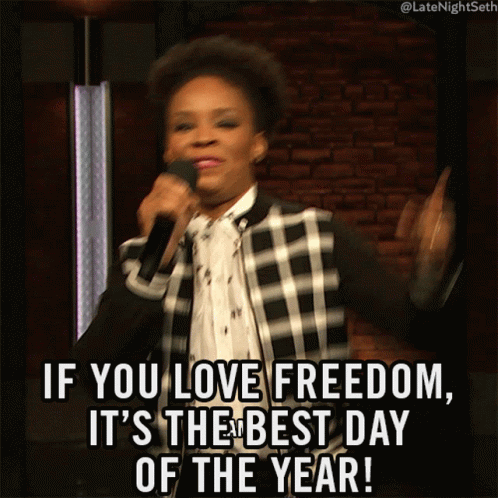 Amber Ruffin on stage, enthusiastically declaring "If you love freedom, it's the best day of the year!"