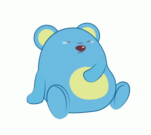 Iggies, a blue bear-like character with a yellow belly, is shown crying with an open mouth, then looking sad.