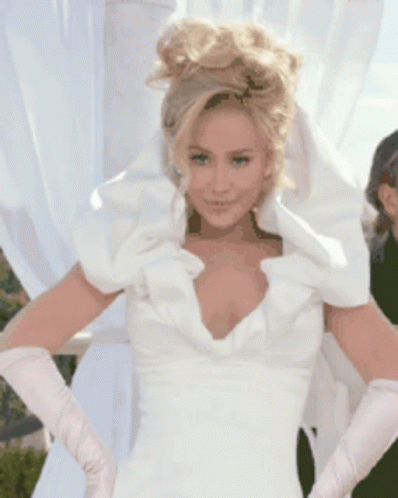 Iggy Azalea, the Queen of Rap, smiles brightly in a white wedding dress with puffy shoulders and long pink gloves.