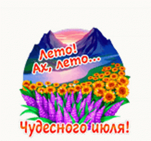 Animated sticker with mountains, sunflowers, and purple flowers, wishing a 'Wonderful July!'