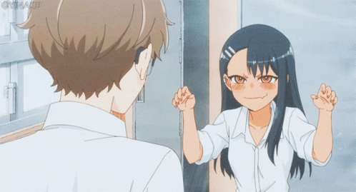Hayase Nagatoro playfully teases Naoto Hachiouji with a 'Gabu Gabu' gesture in Don't Toy With Me, Miss Nagatoro.