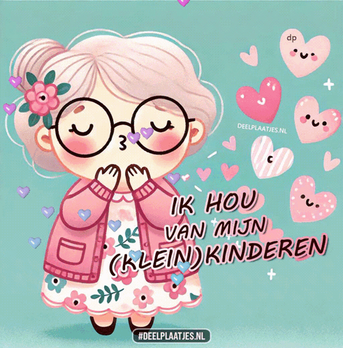 Cute cartoon grandma blowing a kiss with the Dutch caption 'I love my (grand)children'.